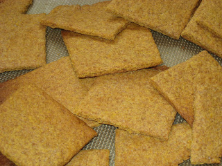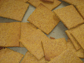 Heat oven to 350. Melt butter in sauce pan or microwave. Stir in the pumpkin. Set aside. In a mixing bowl, stir together flour, sugar, baking powder, baking soda, salt and cinnamon. Add the liquids: honey, water, vanilla, butter, pumpkin. Stir well until a nice ball of dough is formed. Divide into two balls. Cut 2 pieces of parchment paper the size of a cookie sheet. Put one piece on the cookie sheet. Put ball of dough on the paper. Lay the other piece of parchment on top of dough. Squish the dough down a little with your hand. Use a rolling pin to roll the dough between the parchment paper. Roll until the dough covers the whole cookie sheet. Remove the top piece of parchment paper. Repeat with 2nd ball of dough. Cut into squares or shapes. Separate the dough a bit if you’re cutting out shapes. Bake for 13 minutes. Turn off oven, but leave crackers in to get crisp. Remove after 30 min. Break crackers apart (if you just cut the squares and left them close together). Store in airtight container.