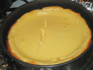 **Normally when I make cheesecake I put tinfoil underneath the pan and around the outside. Then I put it in a large pan and add water. Since this recipe did not say to do either I didn’t this time. Well, part way through baking I noticed a smell and smoke in the kitchen. Some of the butter from the crust was dripping down in the oven. So, a tip…use the foil or at least a baking pan underneath so you don’t end up with a mess.